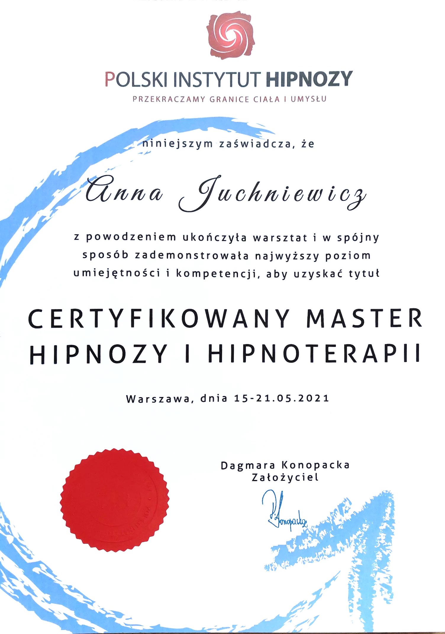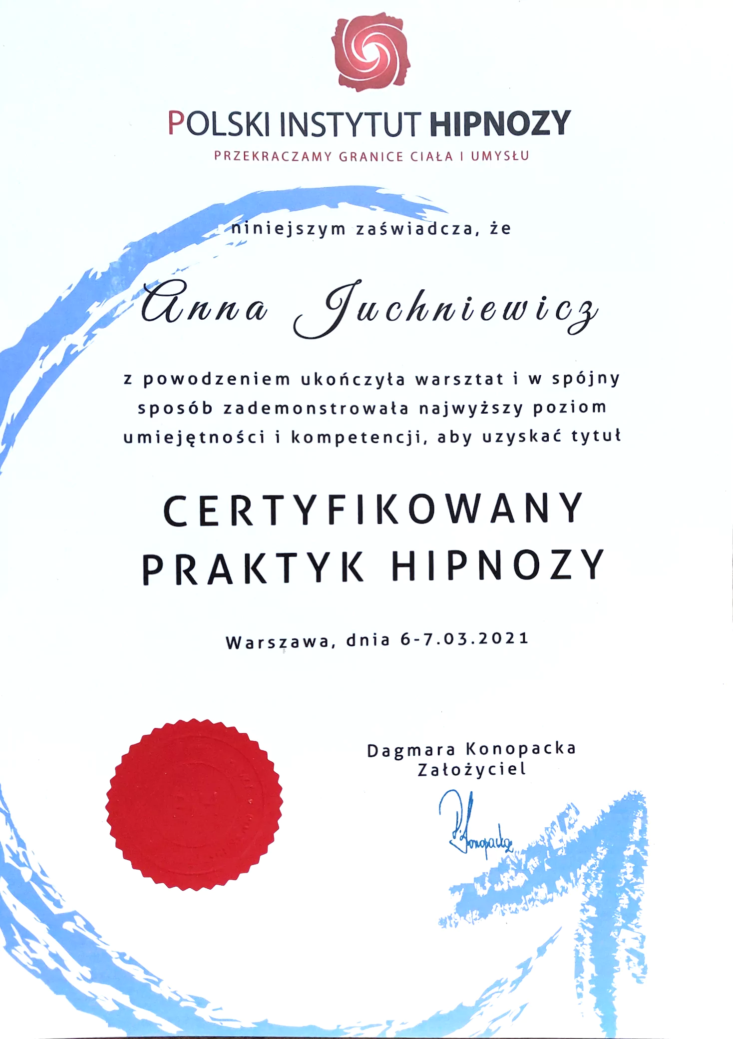 - Certyfikowana Hipnoterapeutka – Praktyk i Master Hipnozy w Polskim Instytucie Hipnozy