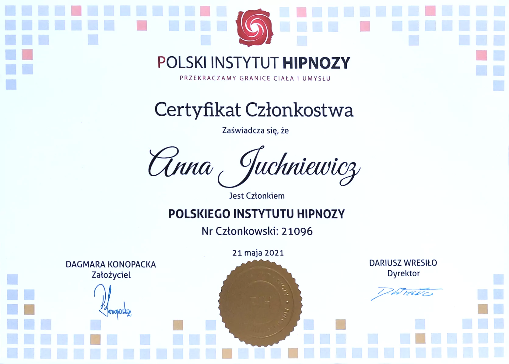 Certyfikowana Hipnoterapeutka w nurcie hipnozy transpersonalnej i członek Polskiego Instytutu Hipnozy i Terapii Transpersonalnych pod superwizją Dagmary Konopackiej