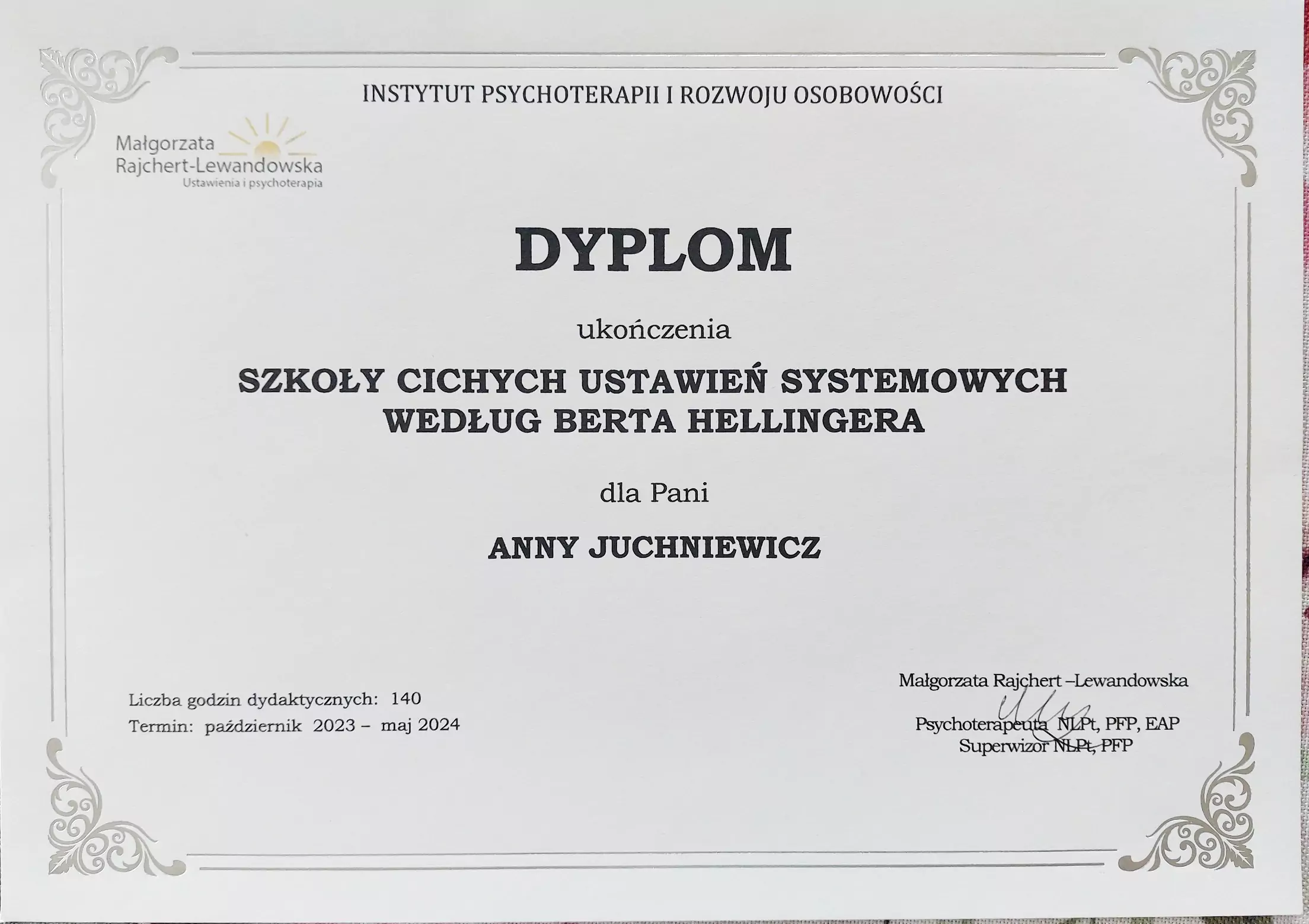 Certyfikowana Terapeutka Ustawień Systemowych metodą Berta Hellingera z dyplomem Szkoły Ustawień Systemowych Małgorzaty Rajchert-Lewandowskiej i pod jej superwizją. Wkrótce dyplomowany Psychotraumatolog po Wyższej Szkole Kształcenia Zawodowego.